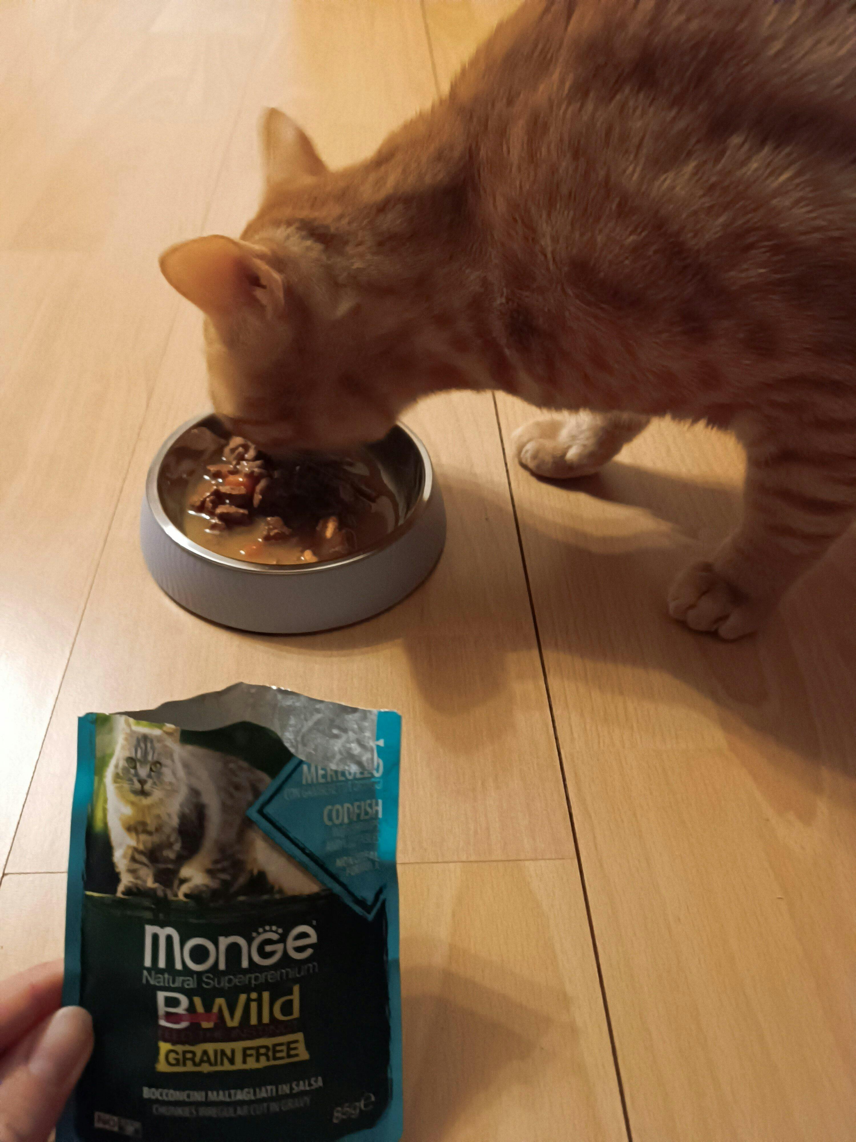 Sudėtis: menkės 26%, kiaulių kepenys, krevetės 4%, šviežios morkos 2%, džiovintos pomidorų išspaudos, džiovintos šparaginės pupelės 1% (atitinka 4,3% šviežių šparaginių pupelių), mineralai, hidrolizuoti gyvūniniai baltymai, ksilooligosacharidai (0,1% XOS), šeriuotoji juka (yucca schidigera) (0,1%), spirulina. Analitinės sudedamosios dalys: žali baltymai 9,5%, žali riebalai 5,5%, žalia ląsteliena 0,5%, žali pelenai 2,6%, drėgnis 79%. Priedai/kg - Maistiniai priedai: vitaminas D3 168 TV/kg, vitaminas E (visų racematų alfa-tokoferilo acetatas) 26 mg/kg, selenas (natrio selenitas 0,01 mg/kg) 0,005mg/kg, manganas (mangano sulfatas monohidratas 2,25mg/kg) 0,73mg/kg, cinkas (cinko oksidas 10,5mg/kg) 8,4mg/kg, varis (vario (II) sulfatas pentahidratas 0,9mg/kg) 0,22mg/kg, geležis (geležies (II) sulfatas monohidratas 7,5mg/kg) 2,46mg/kg, jodas (bevandenis kalcio jodatas 0,12mg/kg) 0,08mg/kg, taurinas 400mg/kg.